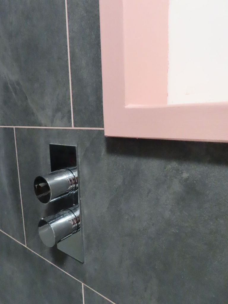 Painting the wooden trim in my bathroom to match the grout…. Achievement…loving grey and pink in my paintings and transferring that to my bathroom*****