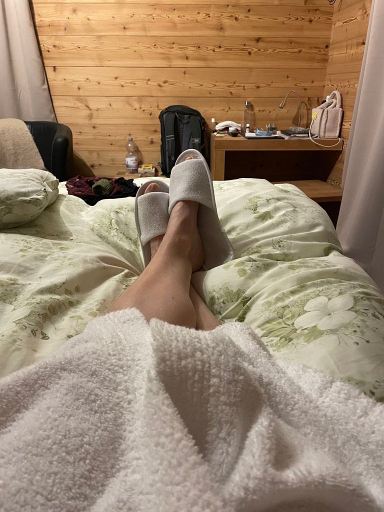 A moment of resting after a great day on the snowboard with bluebird sky followed by a relaxing spa and sauna session at the hotel before the New year’s dinner.