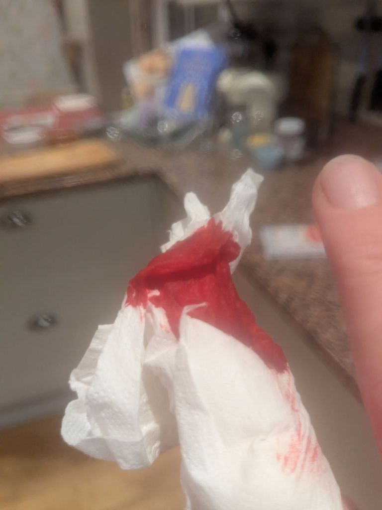 I made chocolate brownies; after baking them and after too much excitement … I managed to cut myself on Otto’s dog food tin as I tried to hurry to get to my friend’s for dinner….the colour of blood is so beautiful though…*****