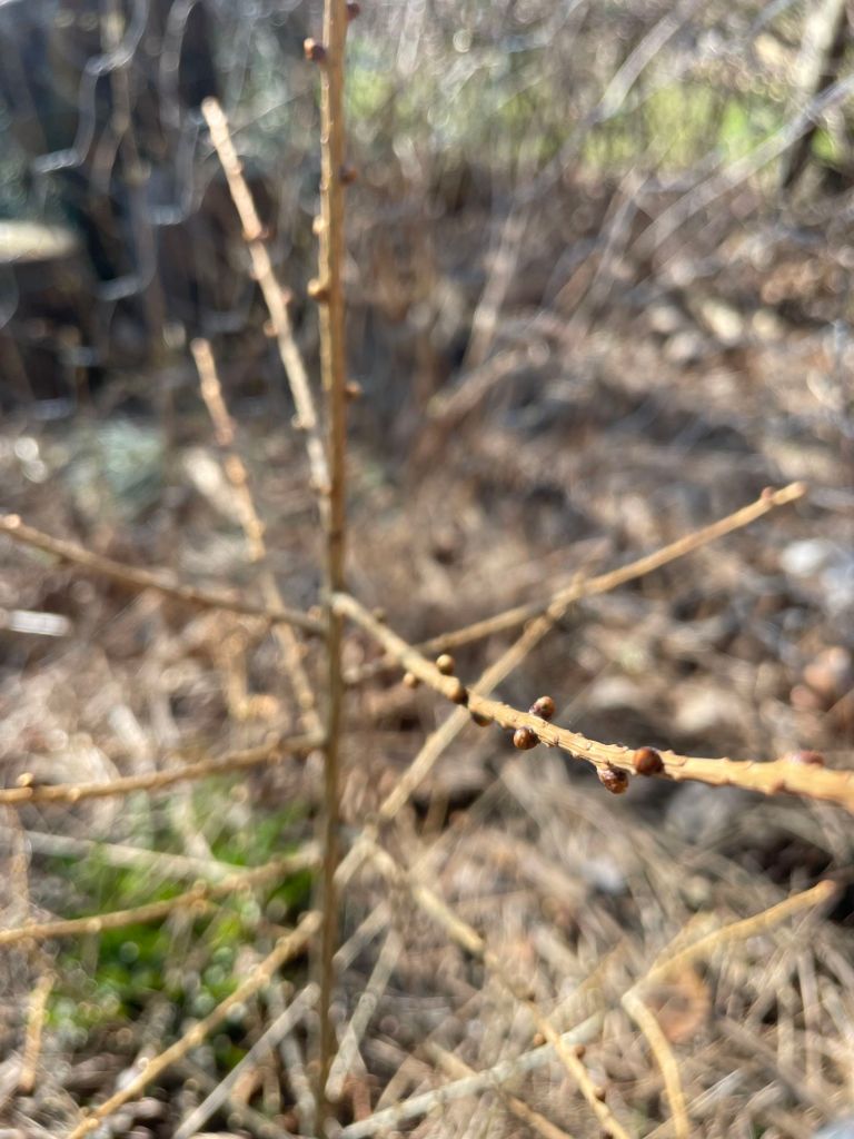 This tree which I found in the wild and replanted in my garden looked really dry and shriveled from a distance but actually had small buds getting ready to sprout.