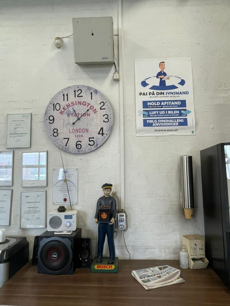 The local car inspection garage with a Kensington clock.