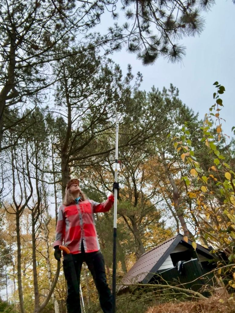 Doing some gardening at the summerhouse; opstammede træer ( not sure about the translation, maybe to stem a tree ?), cutting of big trunks/branches.