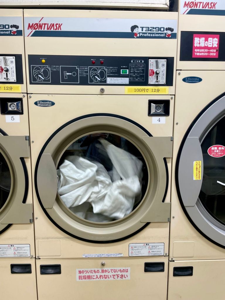 It’s a pretty busy schedule here in Iwama; Getting up at 04.50 in the morning to clean the garden, then morning training from 6 o’clock to 7.30 then breakfast and after that 2 1/2 hours of weeding and cleaning in the garden and Dojo. Then lunch and training again. The humidity is nearly 90% ( my estimate ;), so after each training I need to wash my Gi. The local laundromat, must have their machines from Denmark, because it says ‘møntvask’ on the front.